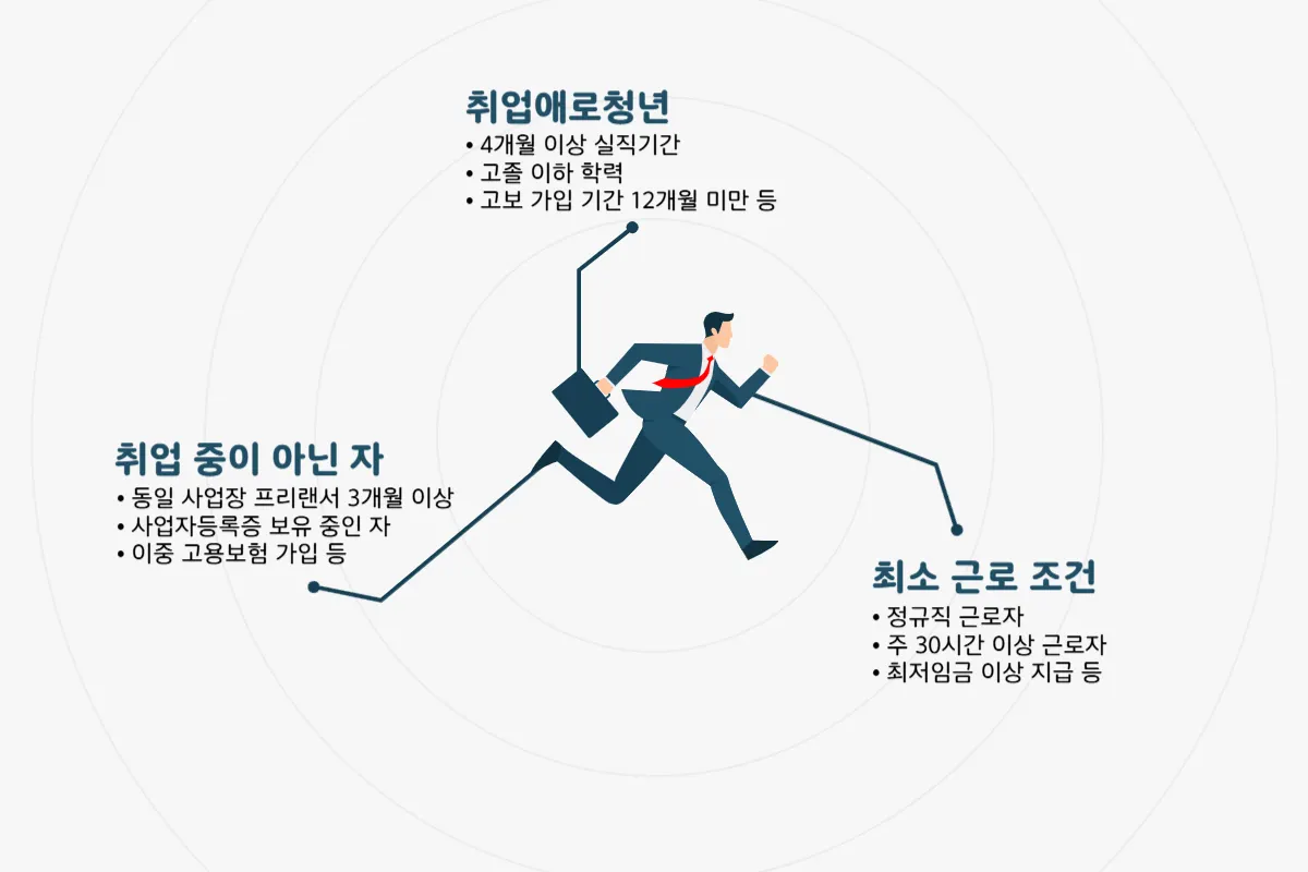 취업애로청년, 4개월 이상 실직, 고졸 이하 학력, 고용보험 가입일 12개월 미만 등 요건 확인.