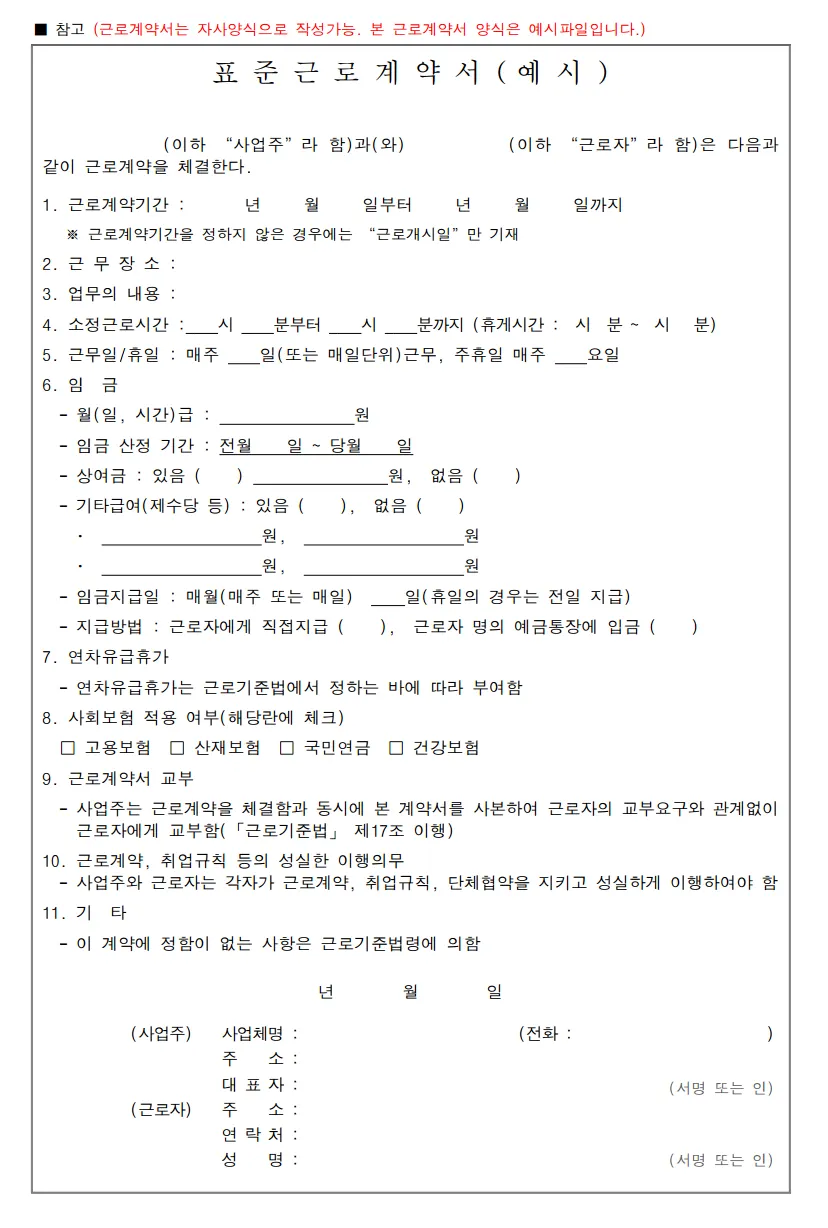 필수적으로 들어가야하는 근로계약서 상의 내용을 표준으로 정한 서식