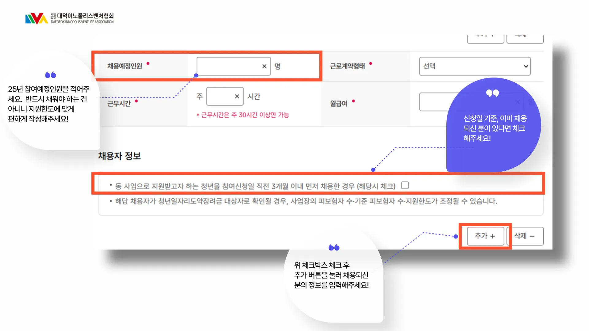 채용예정인원은 “예정”인원으로 반드시 채워야 하는 숫자가 아닙니다. 지원한도에 맞게 여유롭게 신청해주시면 추후 변경 절차가 필요 없으니 편하게 작성해주세요.