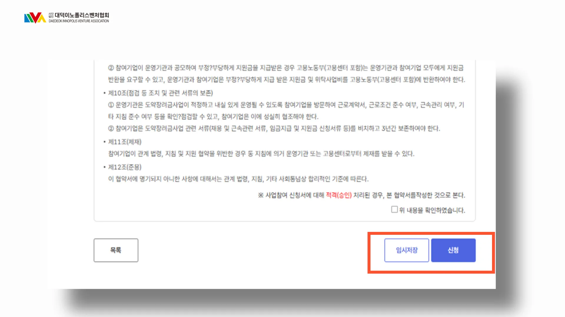 혹시 임시저장을 누른 경우 신청 버튼을 클릭하기 전까지는 운영기관에서 검토가 불가능하니 추후에라도 꼭 신청 버튼을 클릭해주세요!