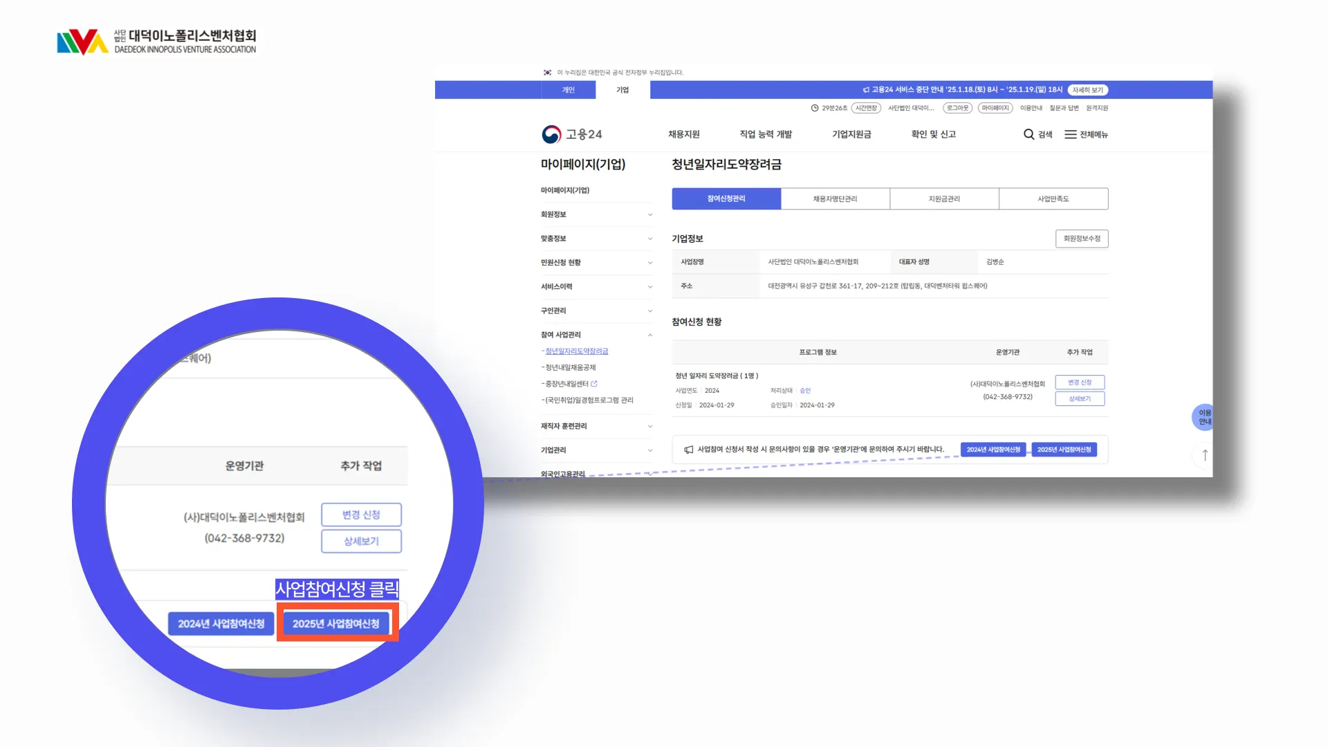 위 이미지와 같이 청년일자리도약장려금 2025년 사업참여신청 버튼을 클릭해주세요