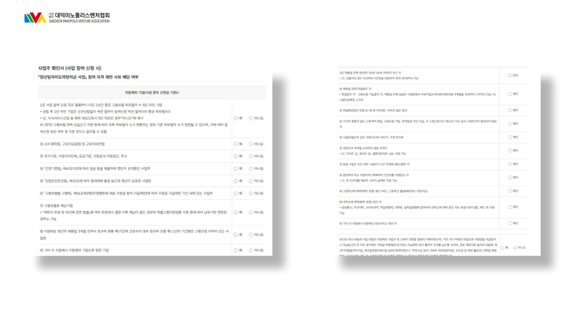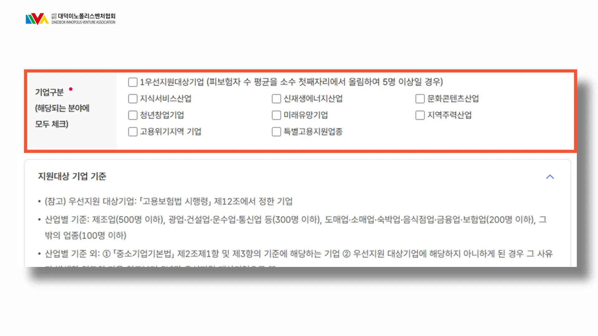 단, 업력 1년 미만의 기업은 체크박스 체크가 필요하지 않습니다.