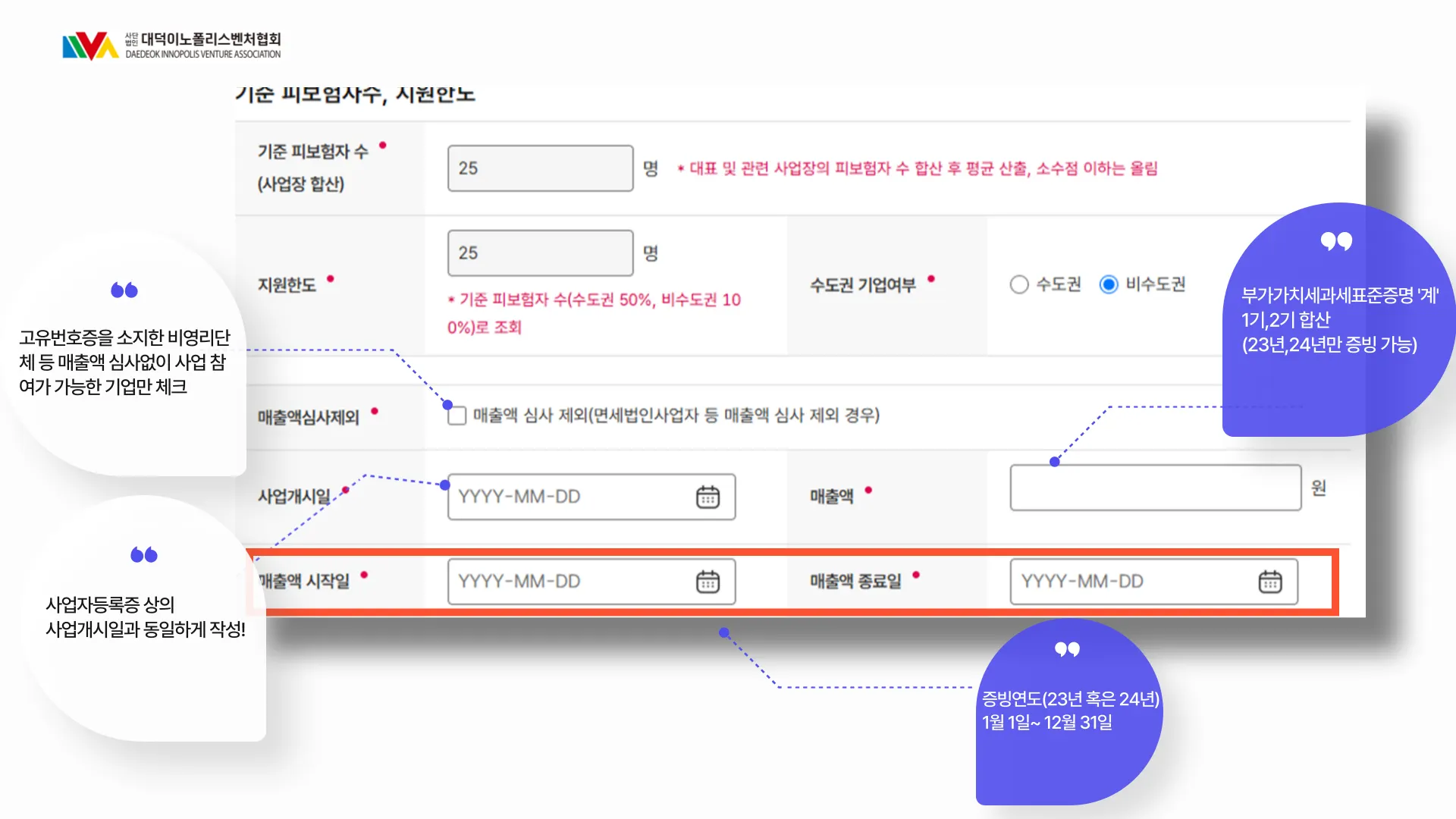 매출액 시작일 종료일은 증빙해주시는 서류의 해당연도(23년 혹은 24년) 1월 1일 ~ 12월 31일로 작성해주세요.