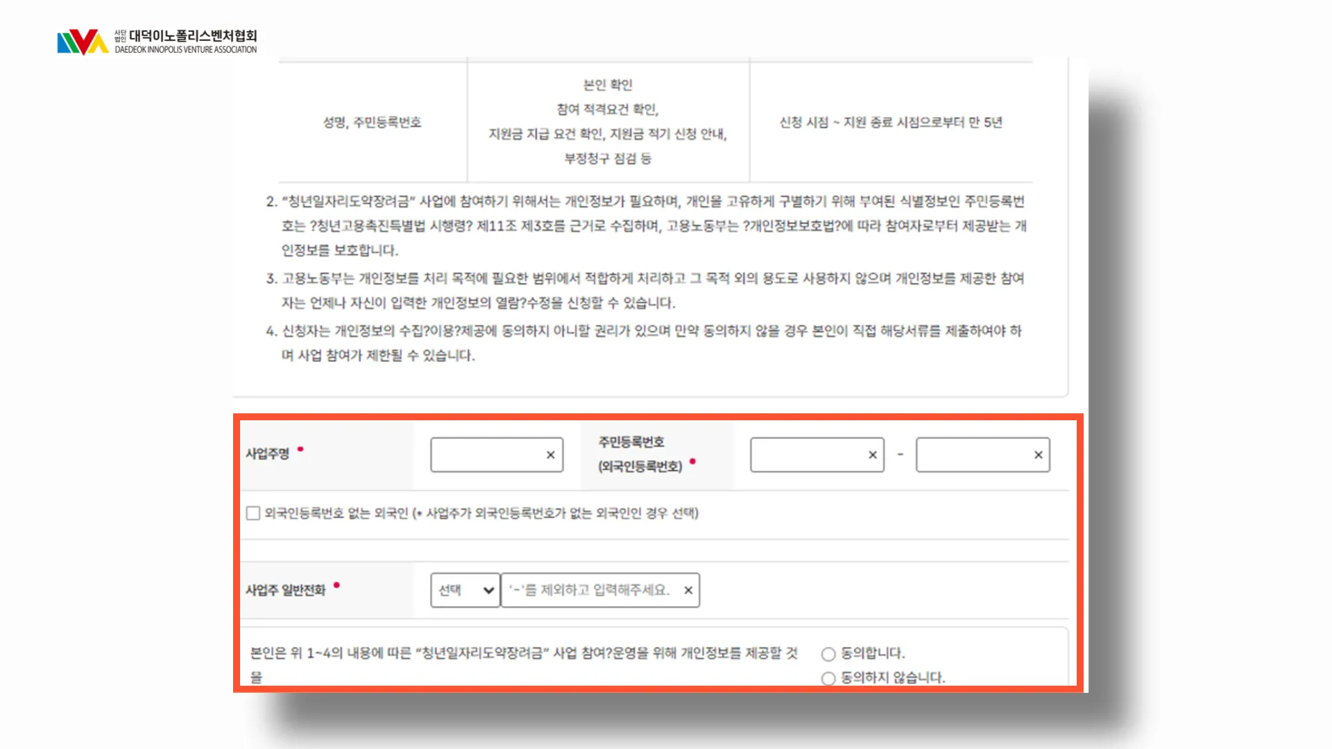 사업주명(대표자 성함), 주민등록번호, 사업주 일반전화(문자 수신이 가능한 휴대전화 번호)를 입력해주세요.