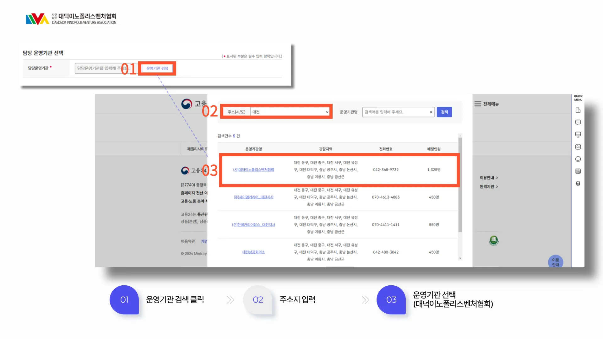 신청 페이지에서 운영기관 검색클릭 후 주소지를 입력하여(대전,논산,공주,계룡,금산)