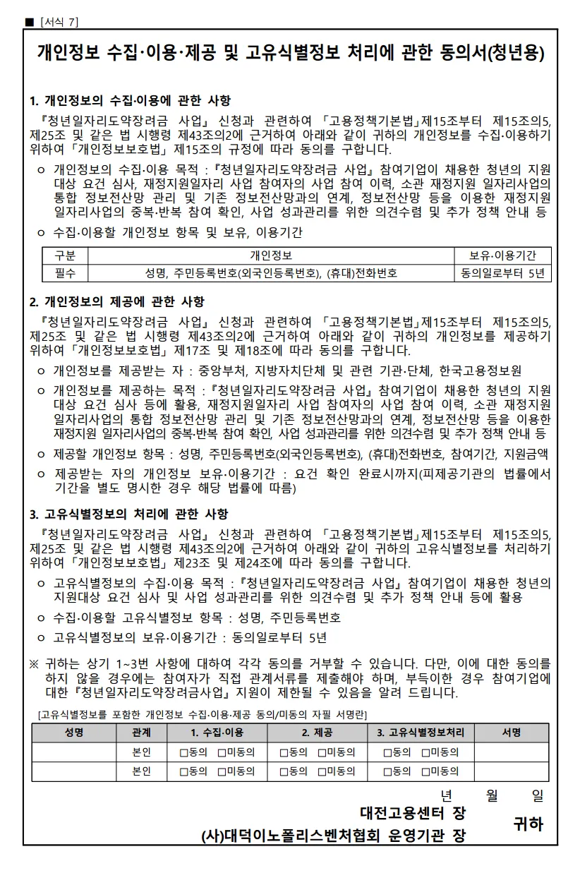 사업에 참여하는 청년 채용자의 경우 관련 개인정보의 수집·이용을 위한 개인의 동의 여부를 받고 해당 서류를 증빙하기 위해 받고 있습니다!