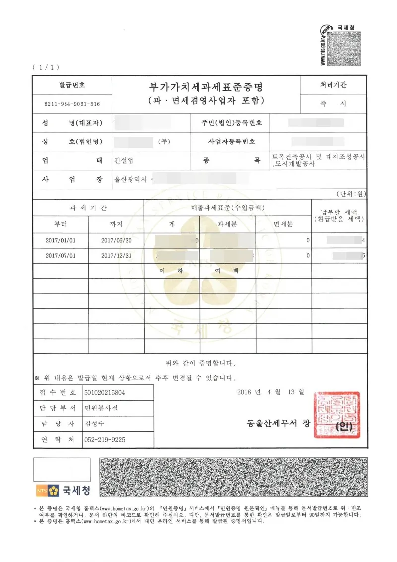 홈택스 로그인 → ‘부가가치세 과세표준증명’ 선택 → 사용용도 관공서 제출용 → 21년 1~2분기 또는 22년 1~2분기 선택 → 출력