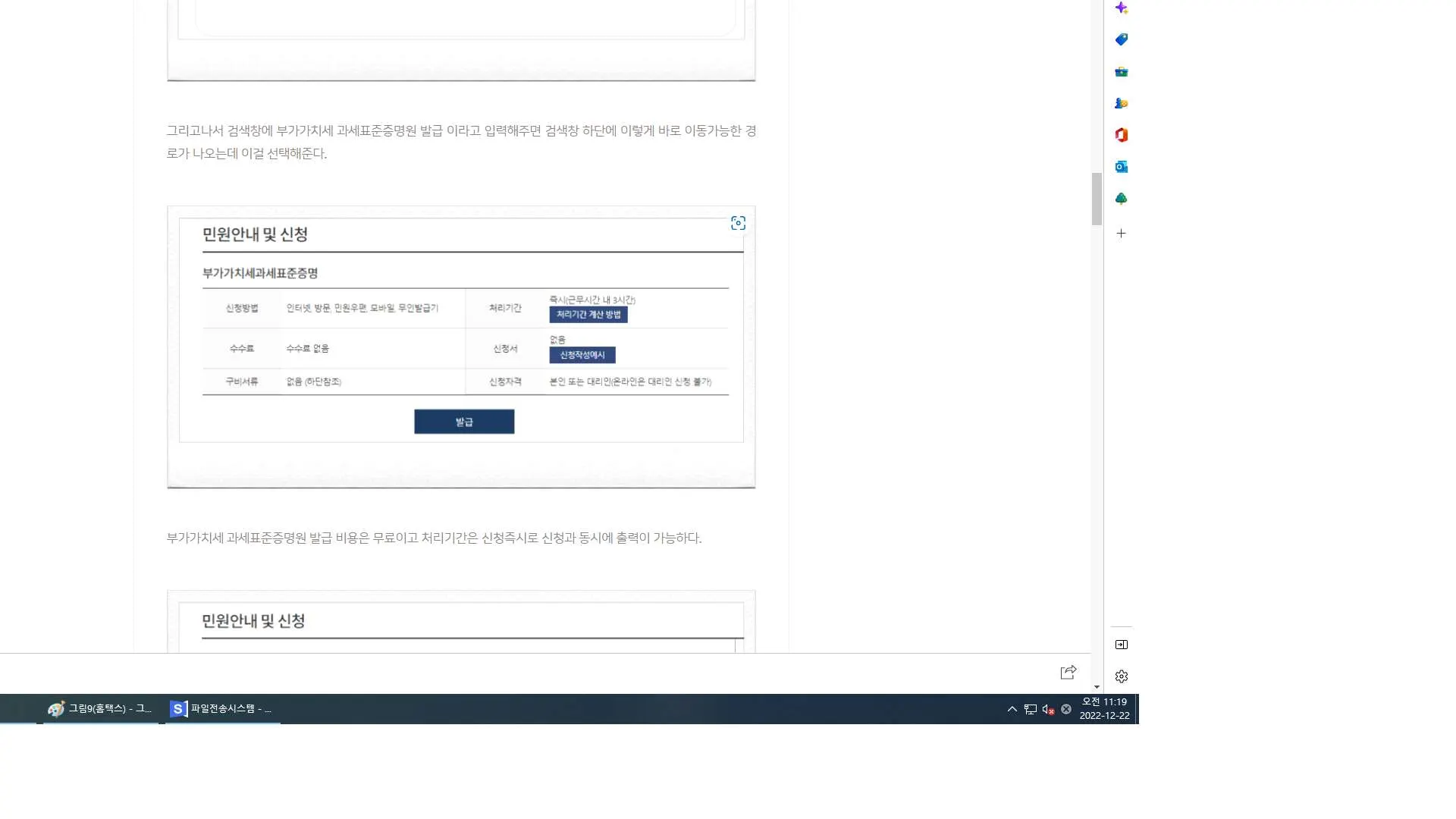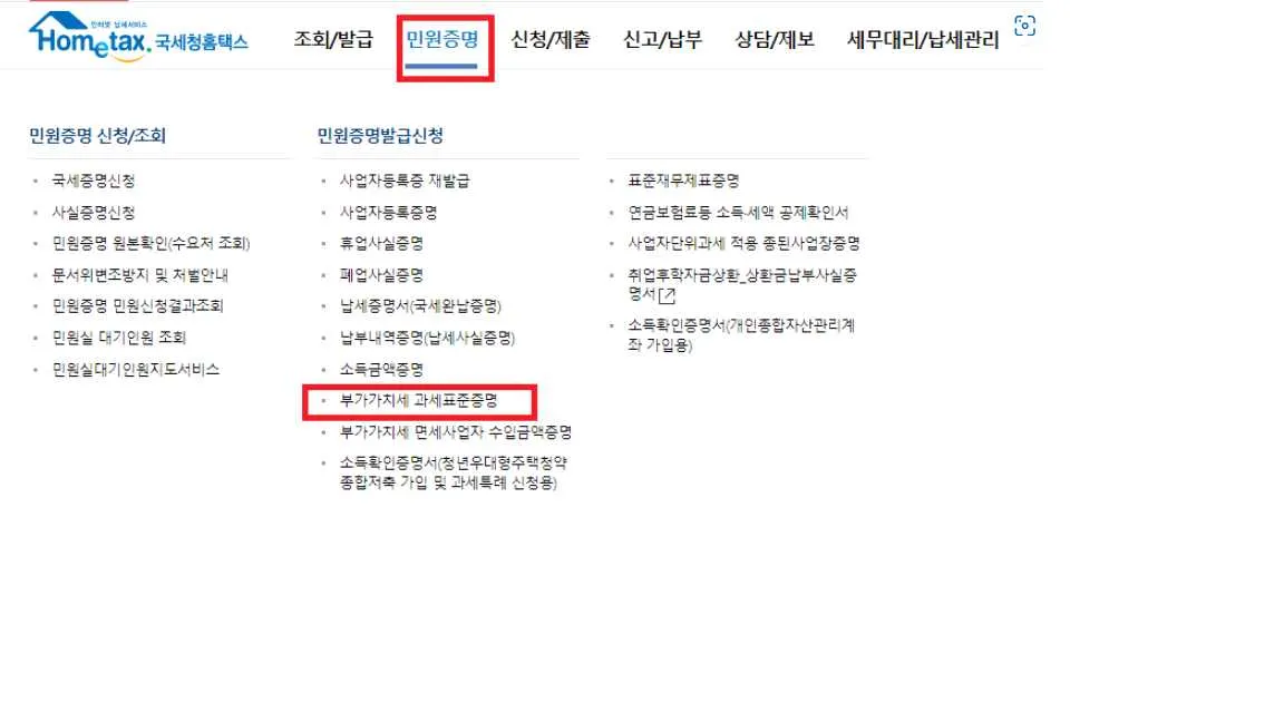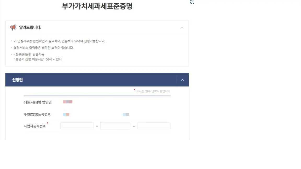 신청인 항목 입력 ▸ 신청내용 항목에서 과세기간은 ’2021년 1~2분기‘ 또는 ’2022년 1~2분기‘ 선택, 발급희망개업일자는 사업자등록증 상에 기재된 개업일을 입력,용도는 ’관공서 제출용‘선택 ▸ 문서 출력