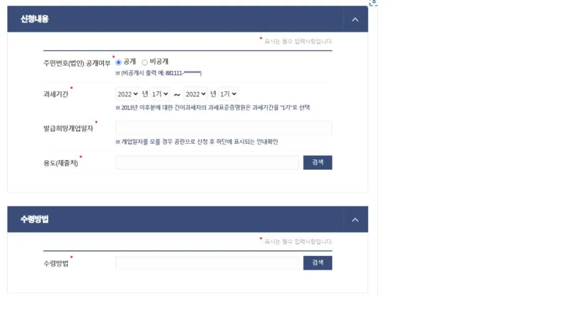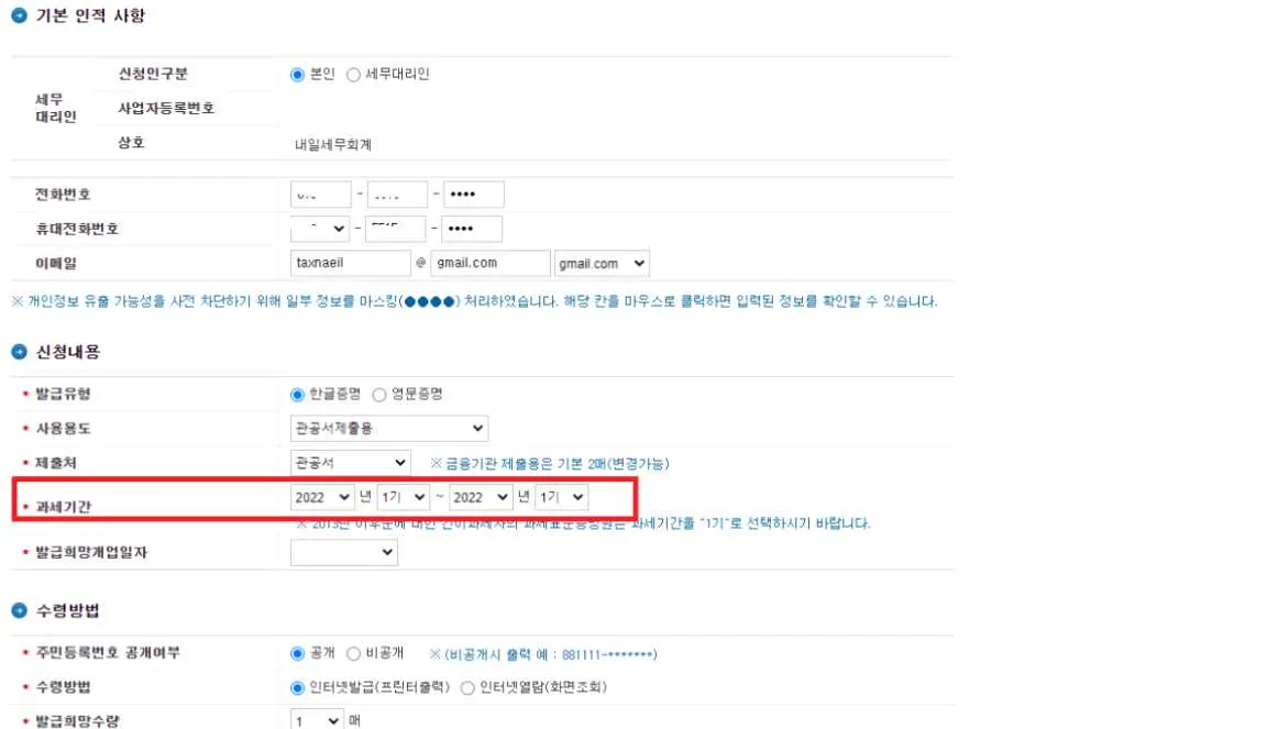 기본인적사항 작성 ▸ 신청내용 항목에서 사용용도는 ’관공서 제출용‘, 과세기간은 ’2021년 1~2분기‘ 또는 ’2022년 1~2분기‘ 선택, 발급희망개업일자는 사업자등록증 상에 기재된 개업일을 입력 ▸수령방법 선택 후 출력